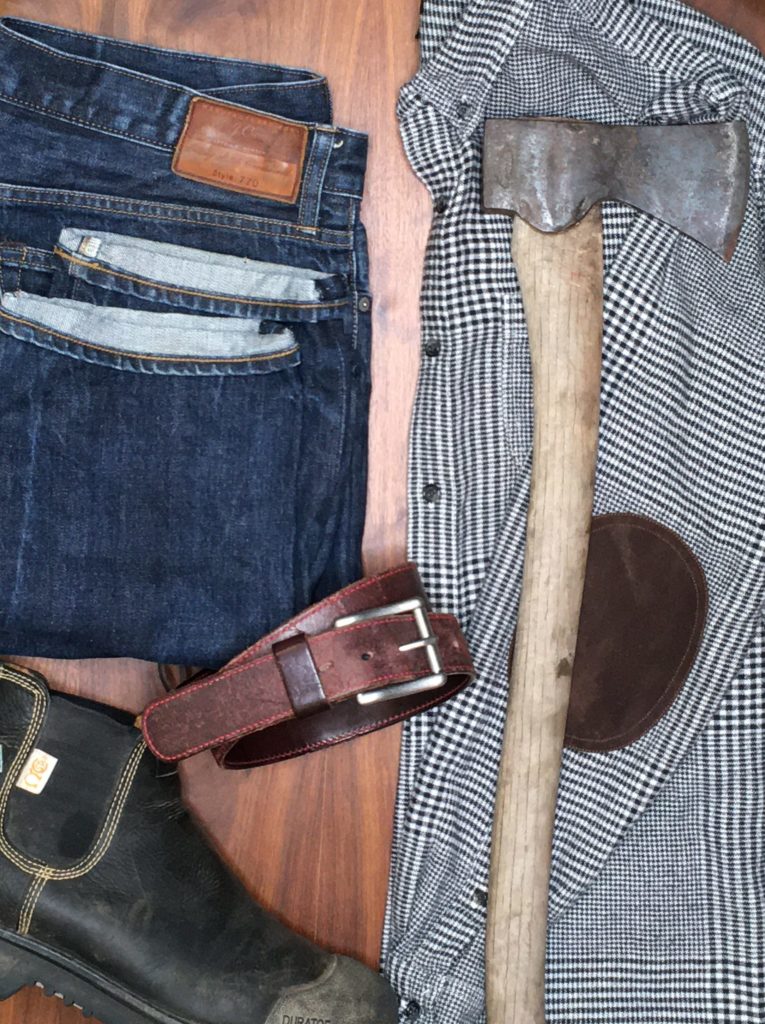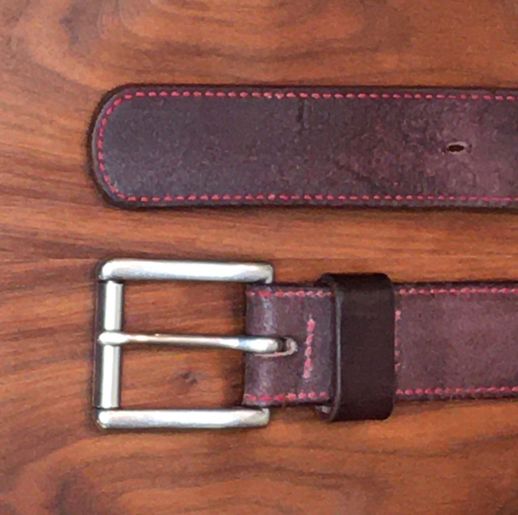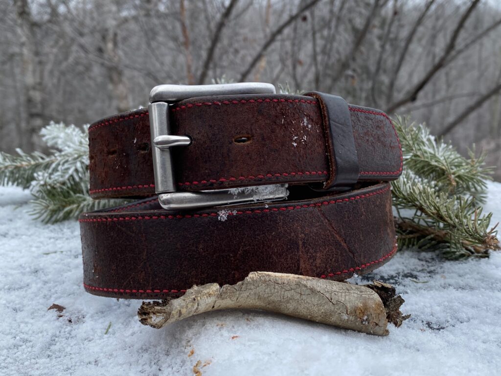 The buckle is a matte finish #49, tumbled Stainless Steel. Stitched with lumberjack Red thread. Finished with a hand rubbed robust wax. This belt possesses all that is needed to define tough. Like the man that wears it, this belt is not one dimensional.