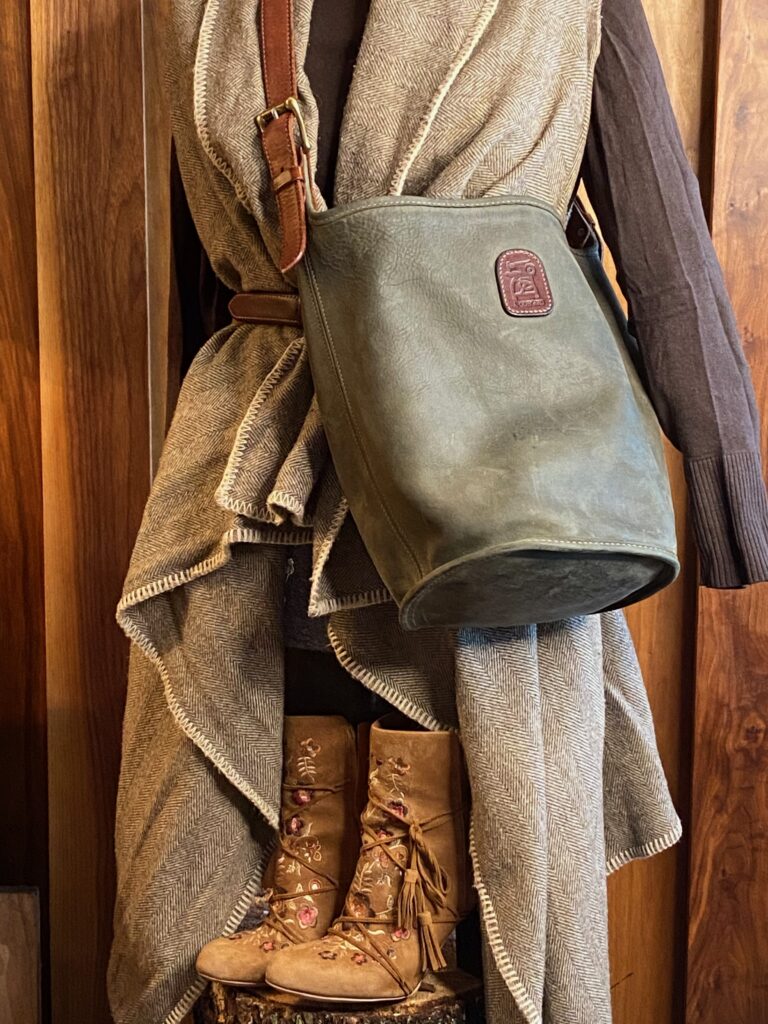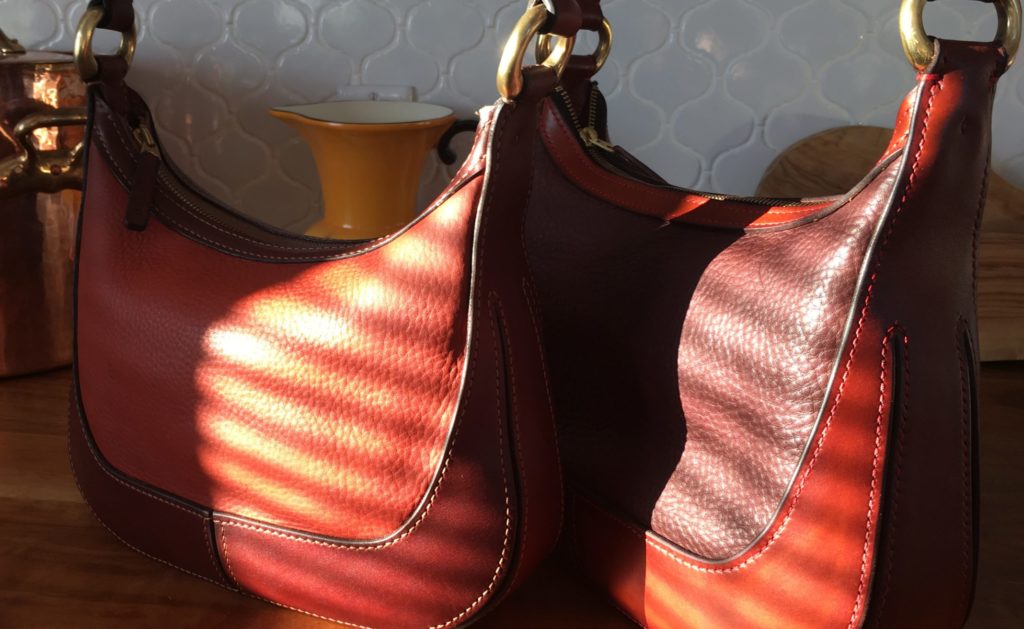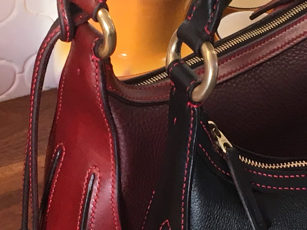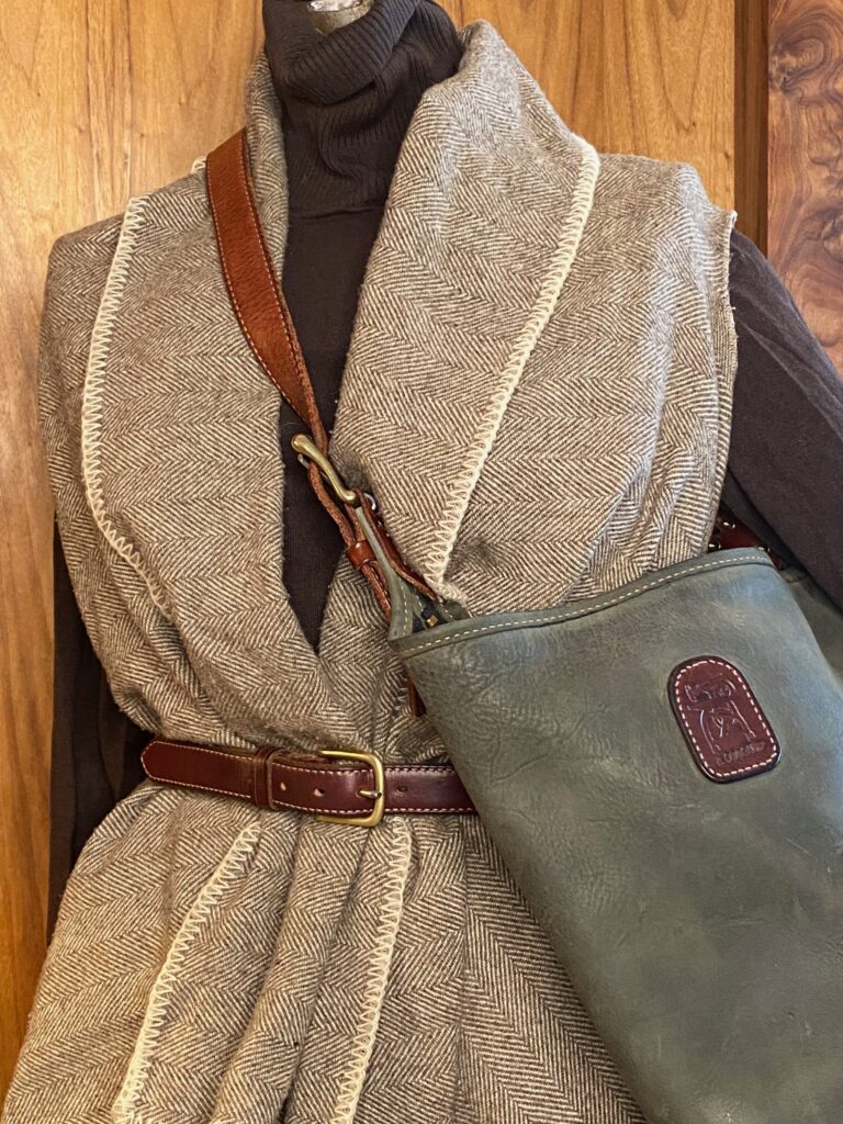 •    It’s all about the straps.  This tote is meant to tote, maybe not a barge or a bale, but it will carry a bushel.  The straps extend from your (or your husband’s) hand, or shoulder, to the bottom of the bag without interruption.  This way the double weight English Bridle handles transfer the weight of your cargo so that you can all make it home in one piece.