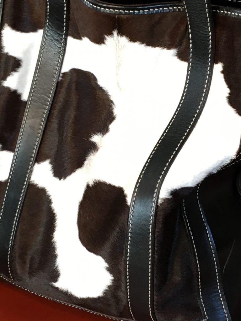 The straps and “frame” of this tote are cut from English Bridle Leather and the panels are hair on hide.  Each panel is different as no two hair growth patterns are identical.  The utility and strength of this beautiful piece can not be over estimated.